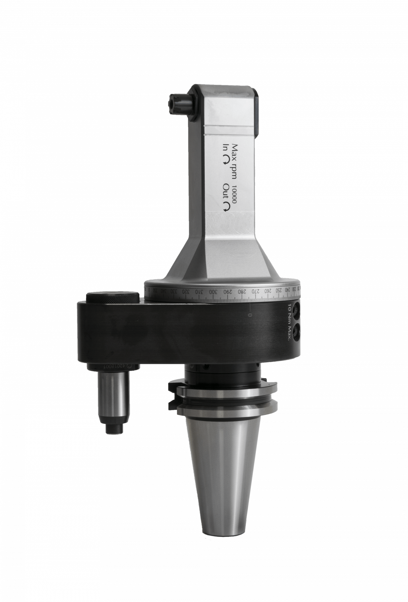 Control Series angle heads are designed to be used on machining centers equipped with automatic tool changers. The orientation ring and the arrester arm, which carries the arrester pin, can both be rotated through 360°. This allows easy adjustment of the drive taper relative to a stop block mounted on the machining center spindle housing.